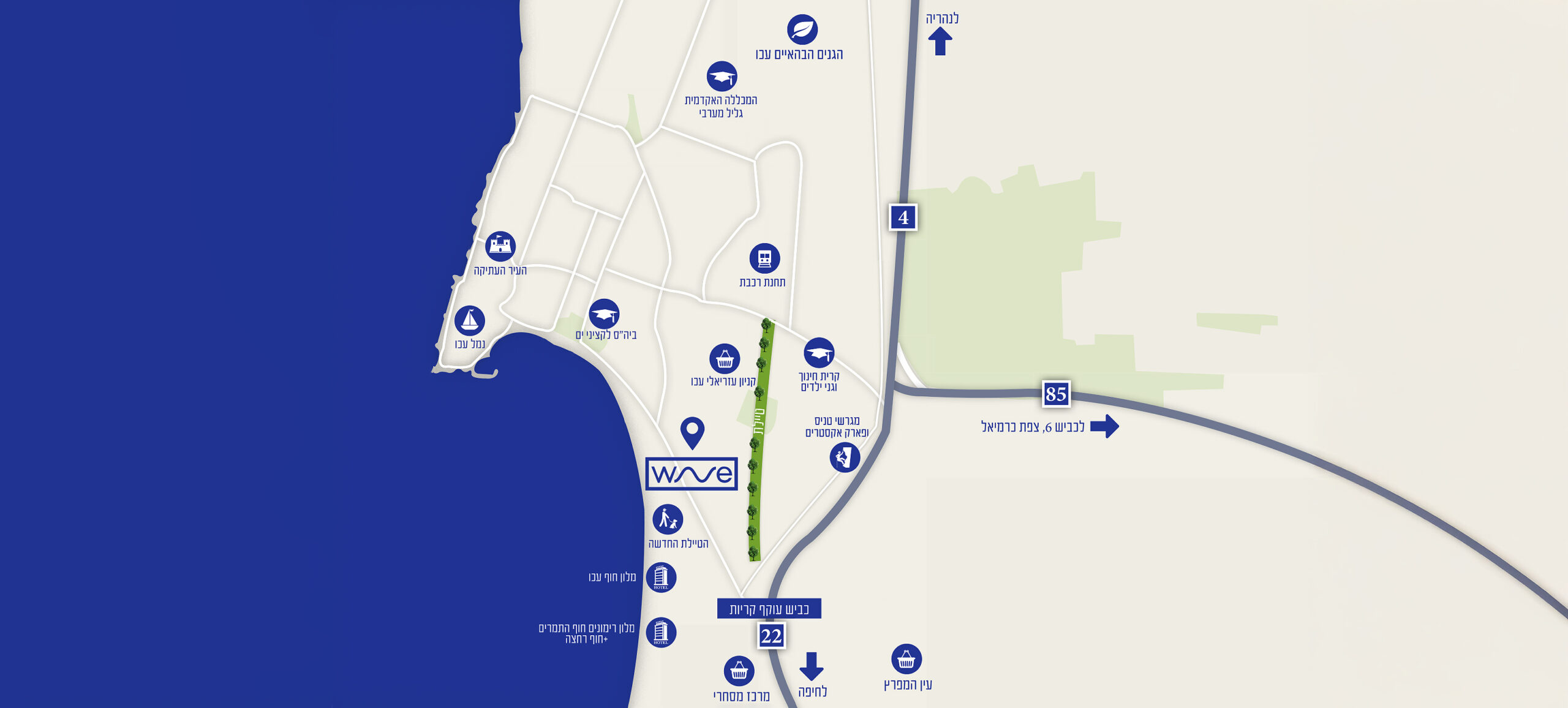 בקו ראשון לים, צמוד לטיילת ולרצועת בתי המלון של עכו החדשה, WAVE מציע חוויית מגורים של ריזורט כל השנה: דירות מרווחות ומעוצבות עם מרפסות מפנקות לנופי גליל וים, מפרט טכני מוקפד ועשיר, ובסביבה עירונית חיה במרחק נגיעה מבתי קפה ומסעדות, קניון עזריאלי, המכללה האקדמית גליל מערבי וצירי התחבורה המרכזיים. לבחירתכם דירות 3-5 חד׳, דירות גן ופנטהאוזים מפוארים.