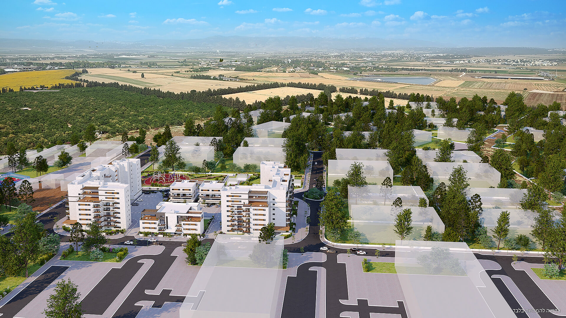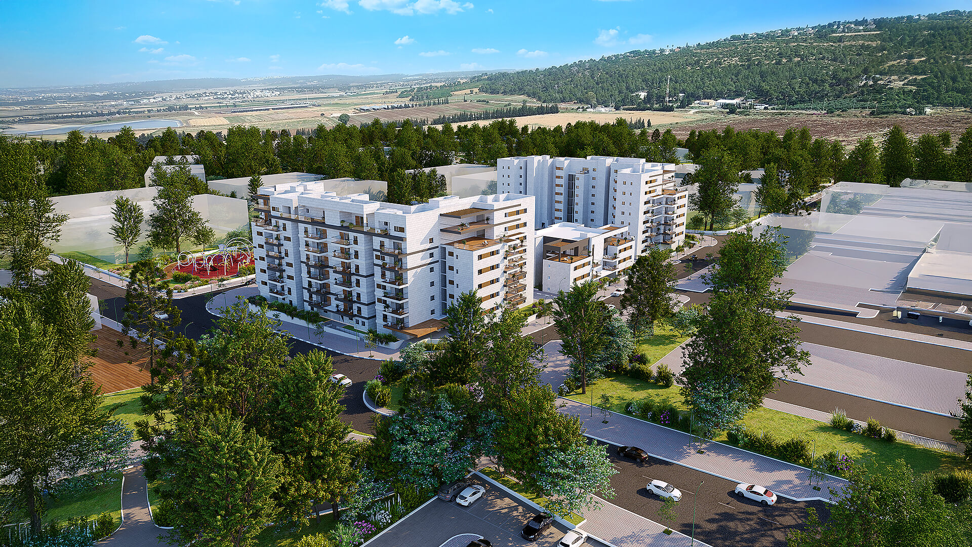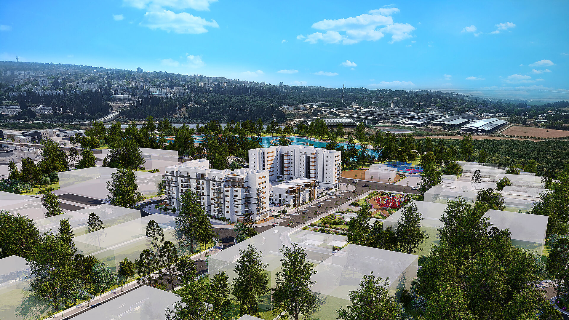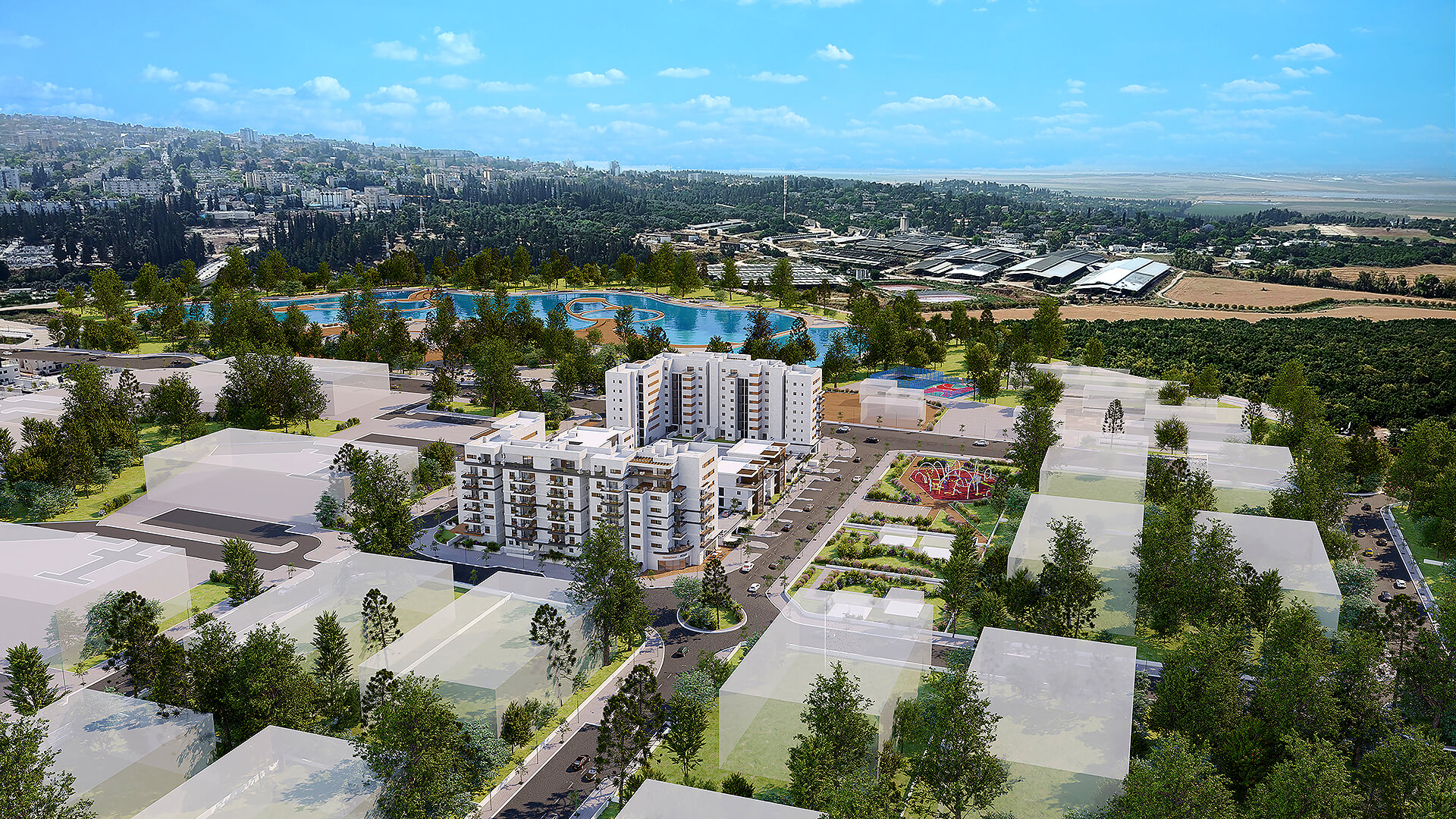 שכונה חדשה, מרחבים פתוחים 5 בניינים בני 3 עד 7 קומות במערב העיר, משולבים בפארק שכונתי ואגם – תכנון שמייצר שקט, פרטיות ואיכות חיים.