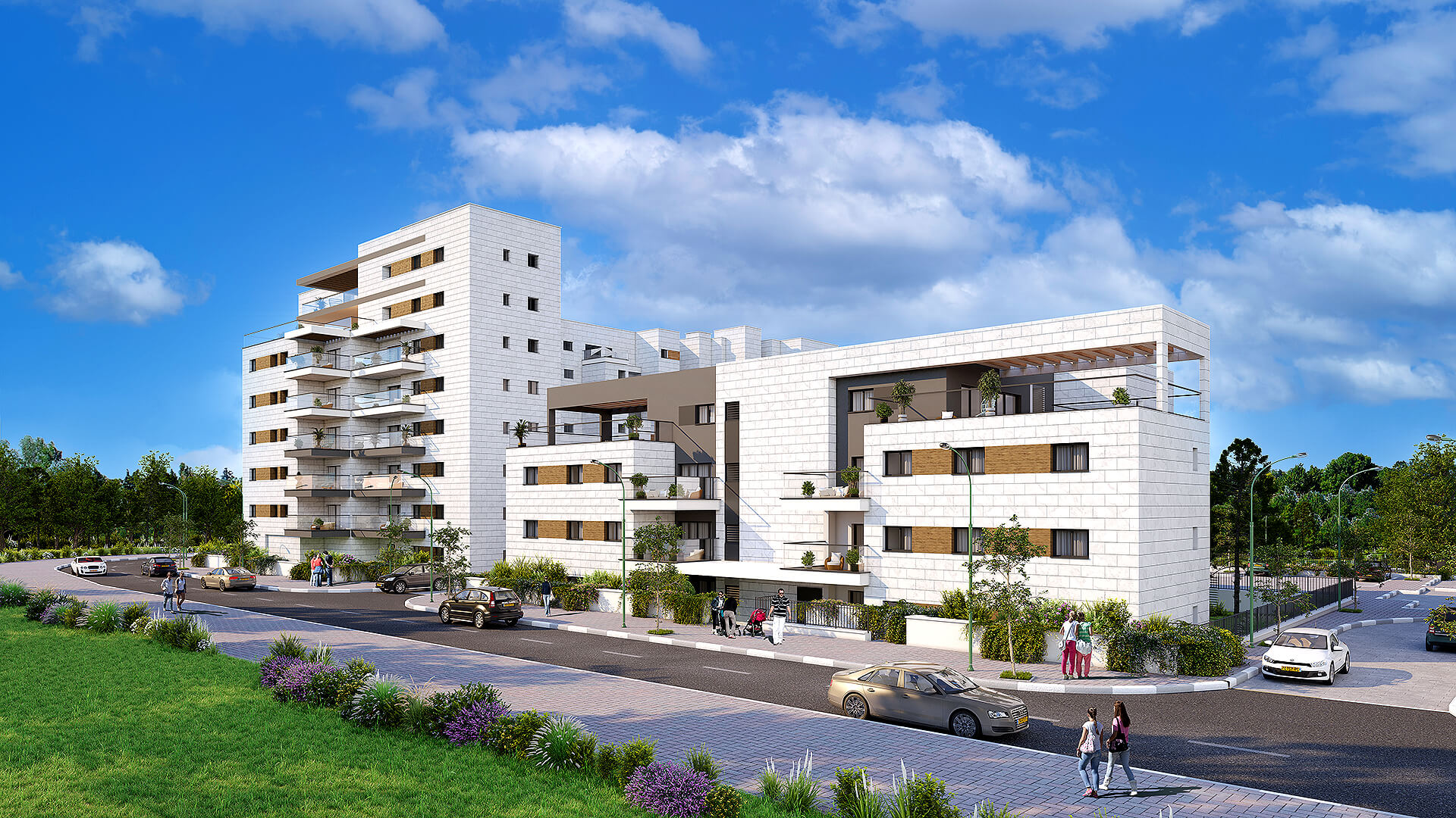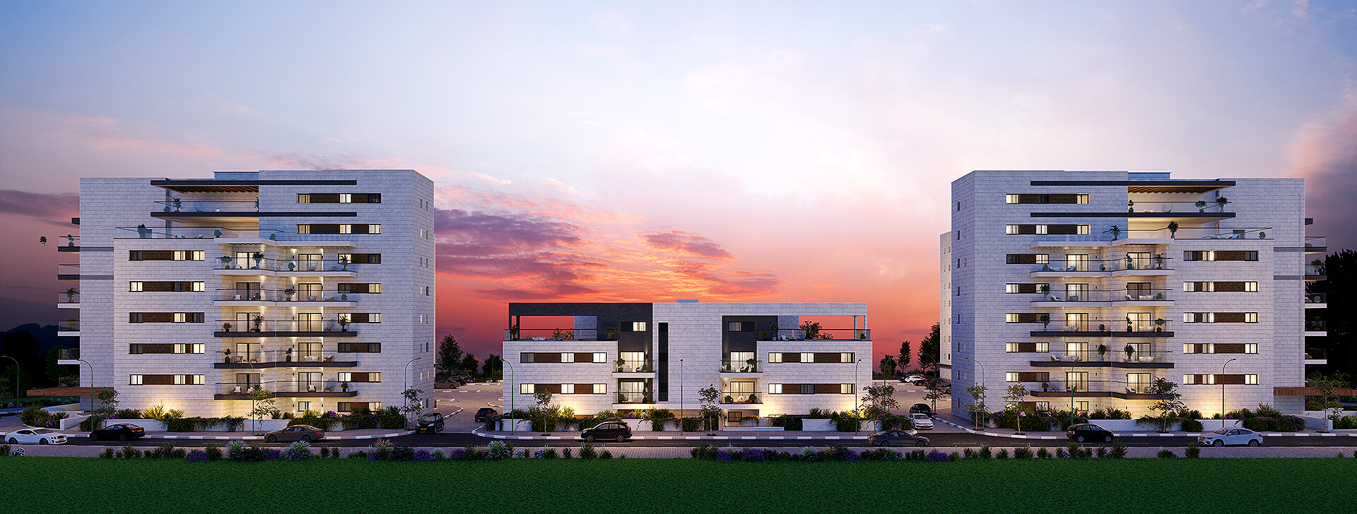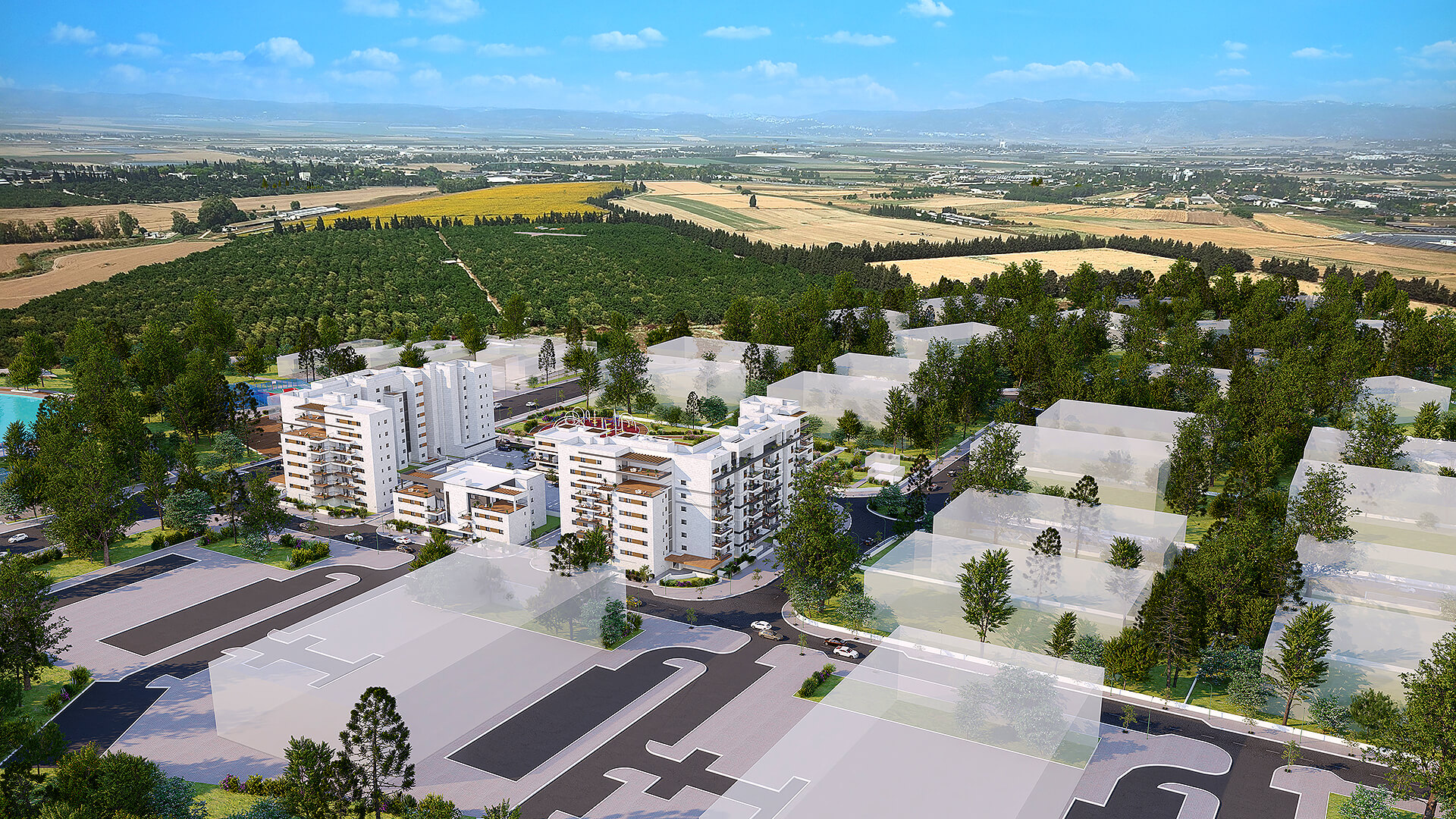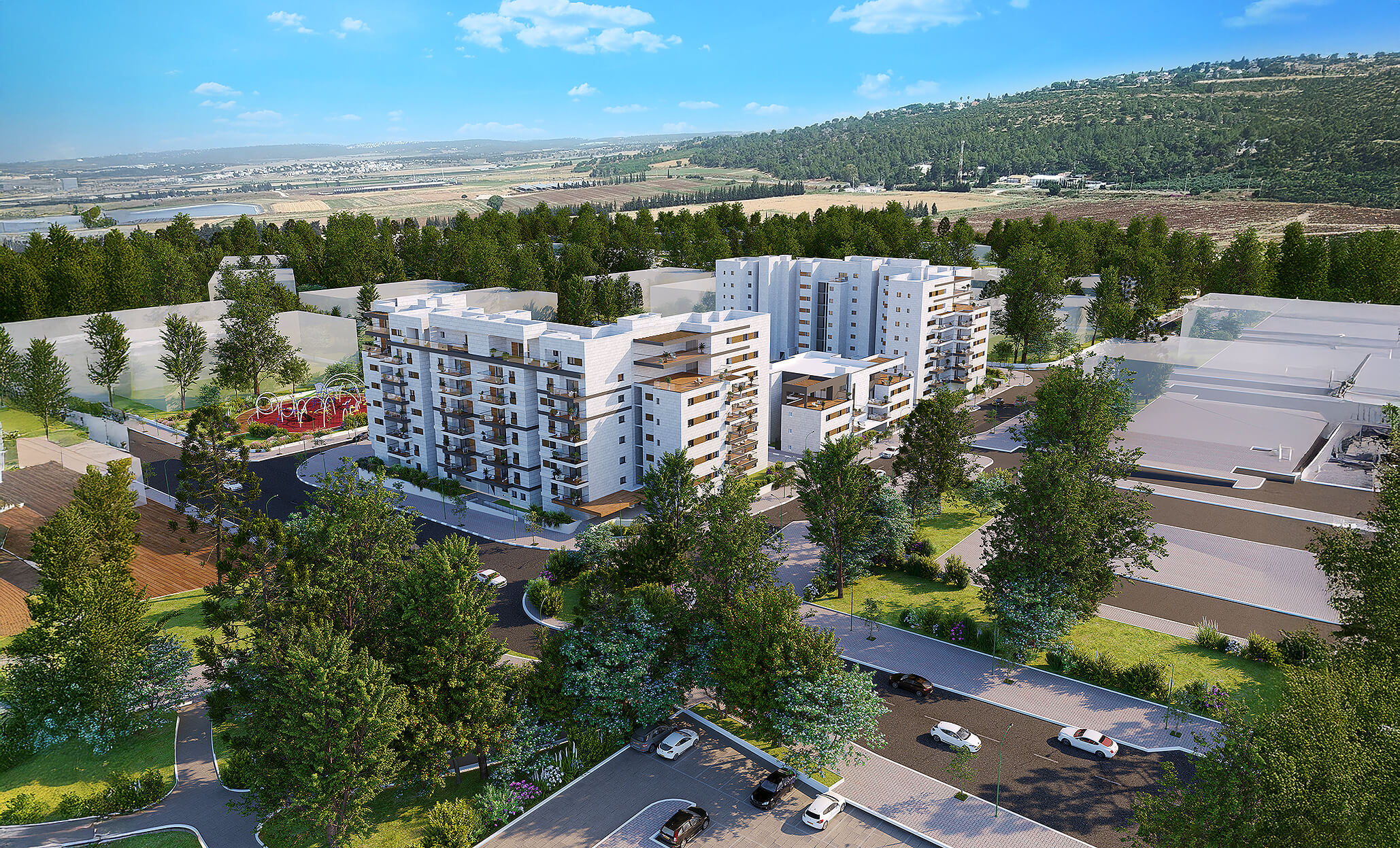 שכונה חדשה, מרחבים פתוחים 5 בניינים בני 3 עד 7 קומות במערב העיר, משולבים בפארק שכונתי ואגם – תכנון שמייצר שקט, פרטיות ואיכות חיים.