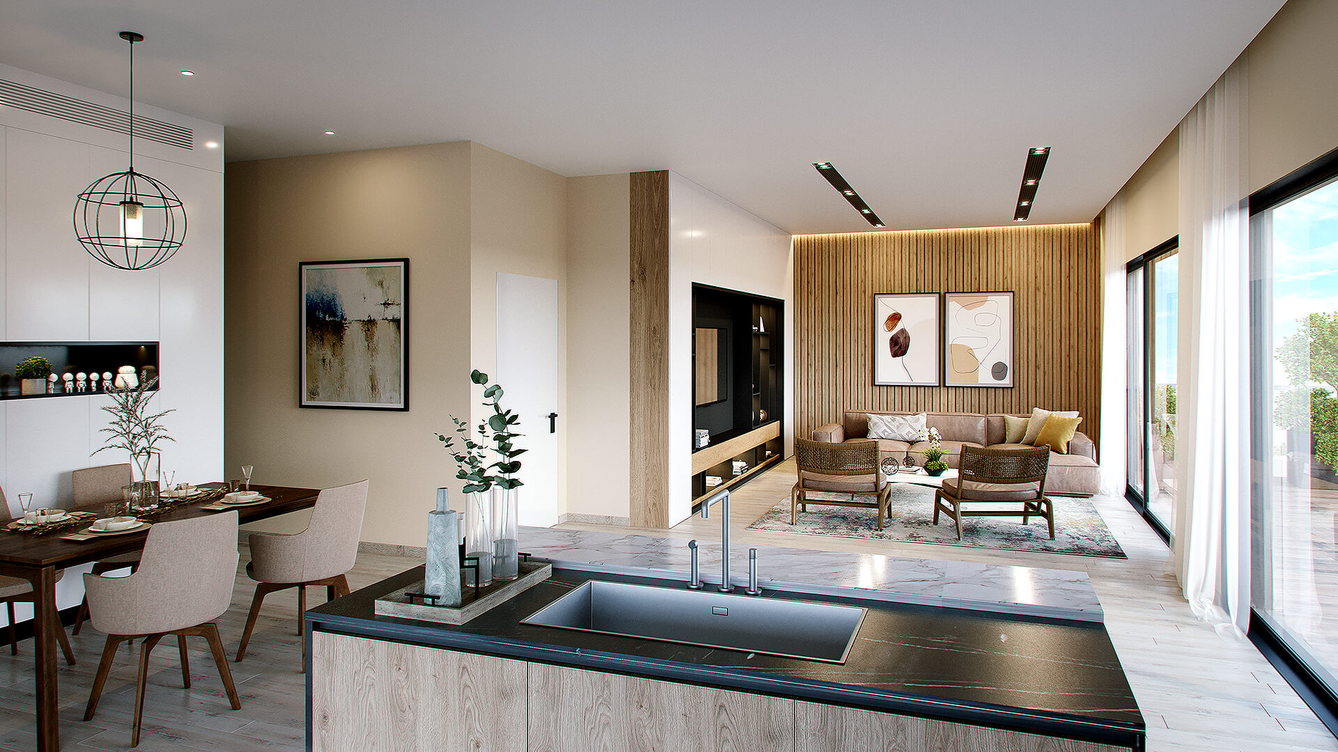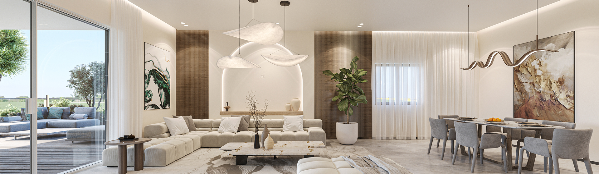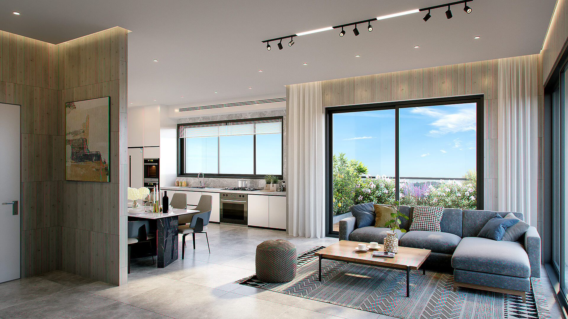 חללים רחבים ומרפסות נוף דגש על סלון אירוח מרווח, מטבח פתוח ומרפסת שמש המשתלבת עם אזור המגורים – התאמה מושלמת לאורח החיים של היום.