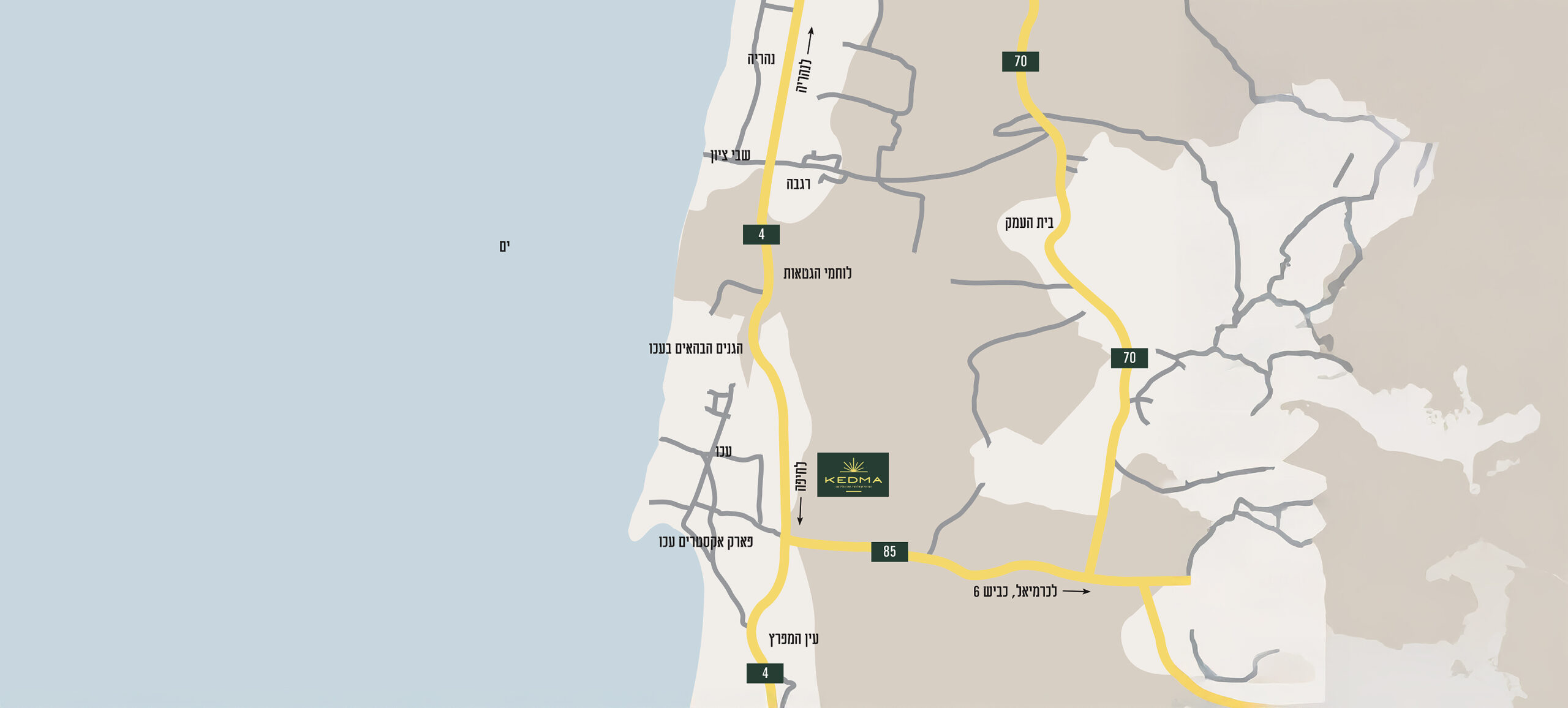 KEDMA ממוקמת בשער הכניסה החדש לגליל המערבי – אזור המתפתח בקצב מהיר והופך למוקד מגורים מרכזי בצפון. השכונה נהנית מסביבה ירוקה, פארקים רחבי ידיים, שבילי הליכה וקרבה למוסדות חינוך, תרבות וההשכלה הגבוהה, ביניהם המכללה האקדמית גליל מערבי. במקביל, מערך התחבורה המתקדם באזור – כביש 6, כבישים 70 ו-85, עוקף קריות וקישור נוח לתחנות הרכבת לכיוון חיפה, הגליל ותל אביב – מאפשר לכם ליהנות משקט של פרבר ירוק בלי לוותר על נגישות גבוהה למרכזי התעסוקה והבילוי.